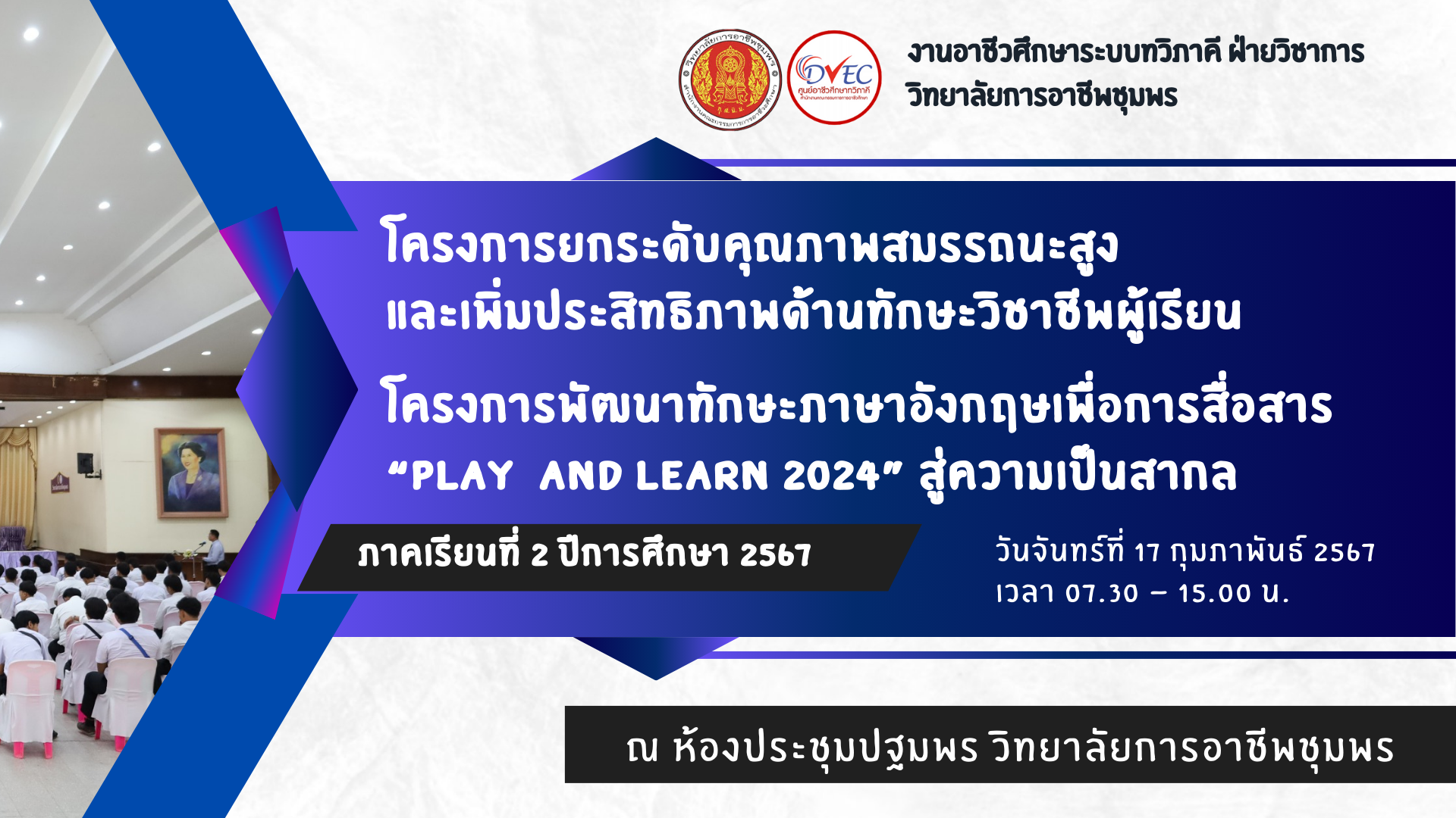 นักศึกษาระดับชั้น ปวส.2 แผนกวิชาคอมพิวเตอร์ธุรกิจ แผนกวิชาการบัญชี แผนกวิชาไฟฟ้ากำลัง แผนกวิชาตัวถังและสีรถยนต์ และแผนกวิชาช่างยนต์ ในวันจันทร์ ที่ 17 กุมภาพันธ์ 2568 เวลา 07.30 – 15.00 น. ณ ห้องประชุมปฐมพร วิทยาลัยการอาชีพชุมพร
